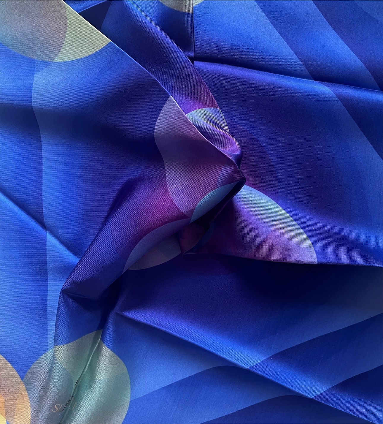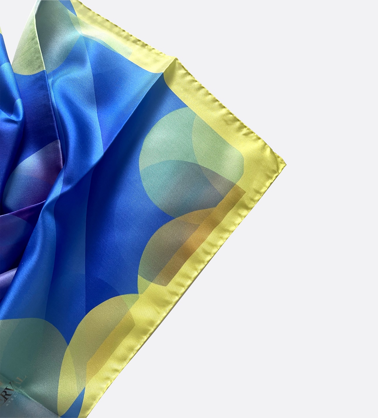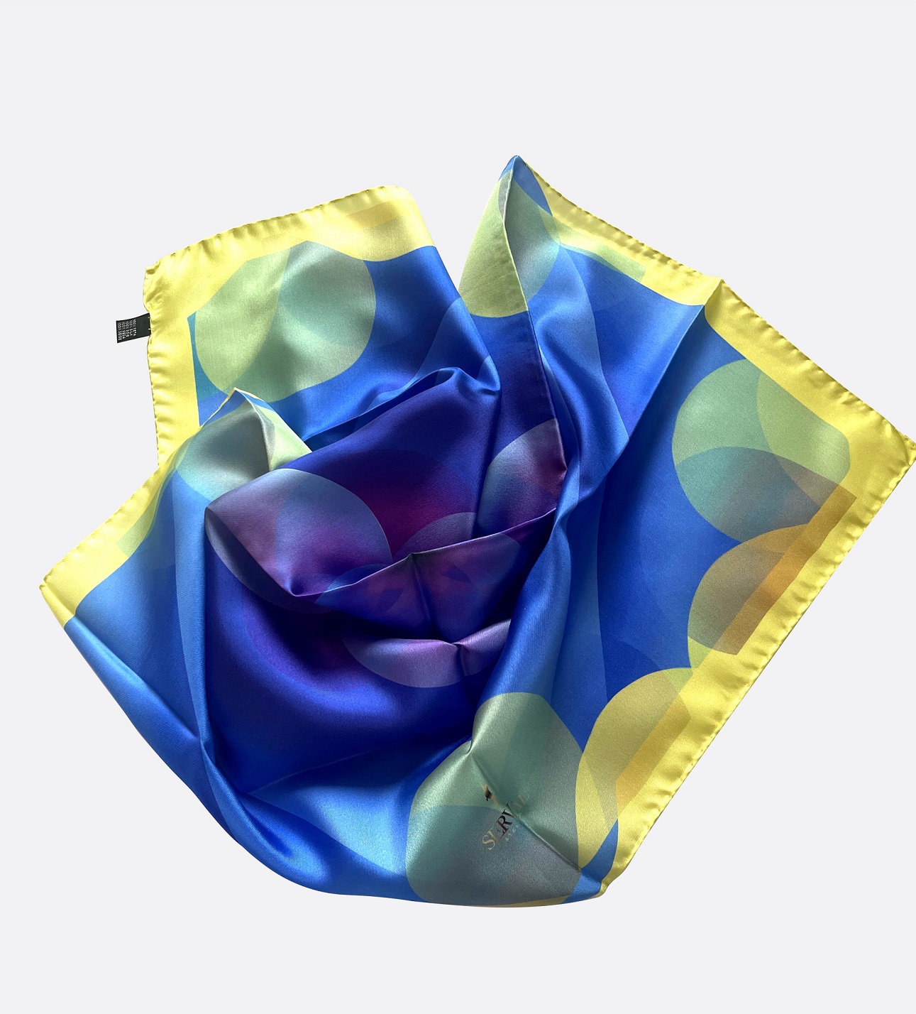 Tondo Azure twill silk scarf is created by combining forms of the natural world, characterized by sinuous, sculptural, organic shapes, arches, curving lines, and sensual ornamentation. The forms presented here in the interference of waves intertwine in an incredible way allowing to create fantastic color transitions.