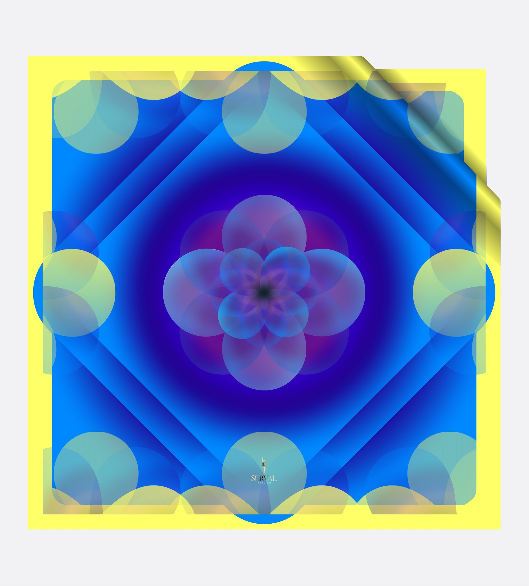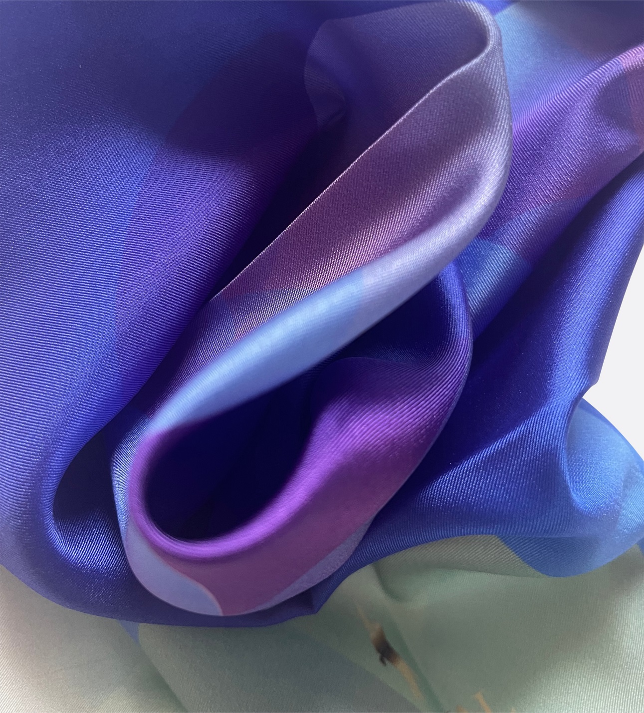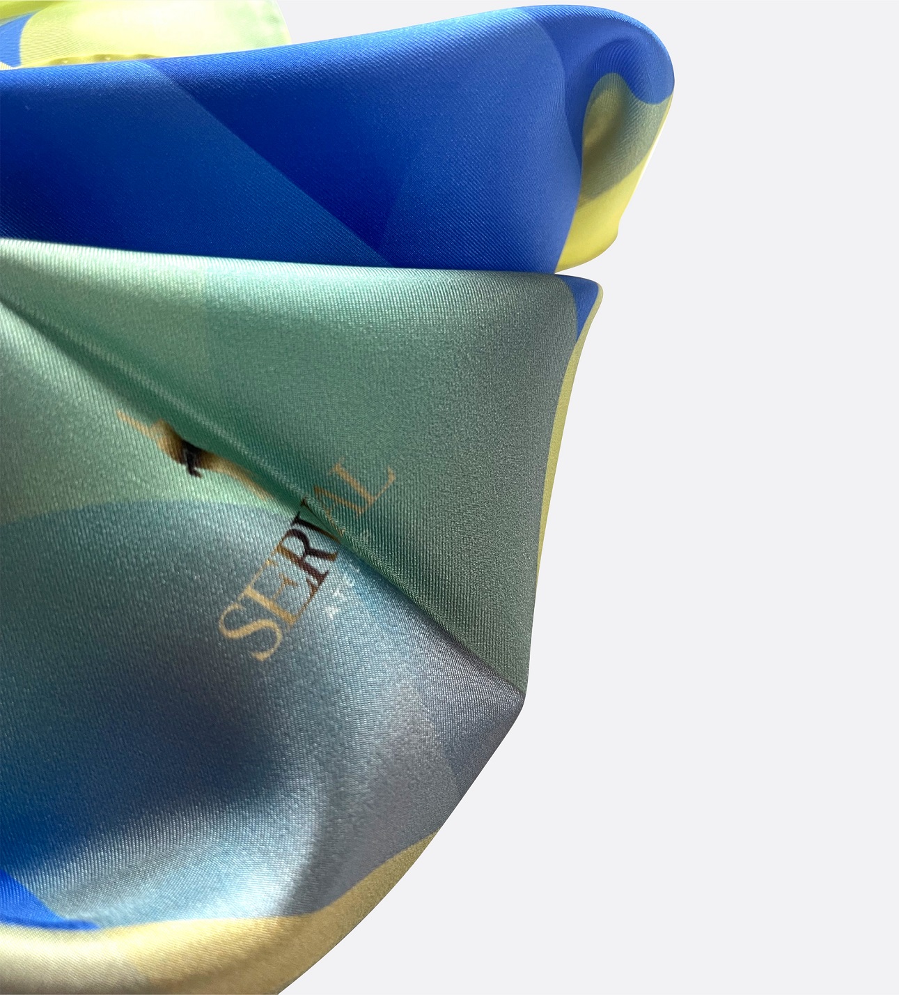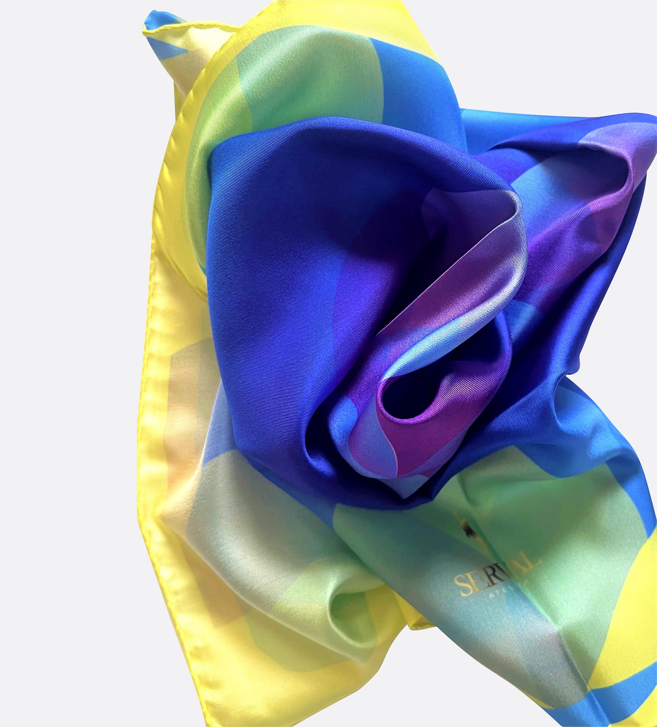 Tondo Azure twill silk scarf is created by combining forms of the natural world, characterized by sinuous, sculptural, organic shapes, arches, curving lines, and sensual ornamentation. The forms presented here in the interference of waves intertwine in an incredible way allowing to create fantastic color transitions.
