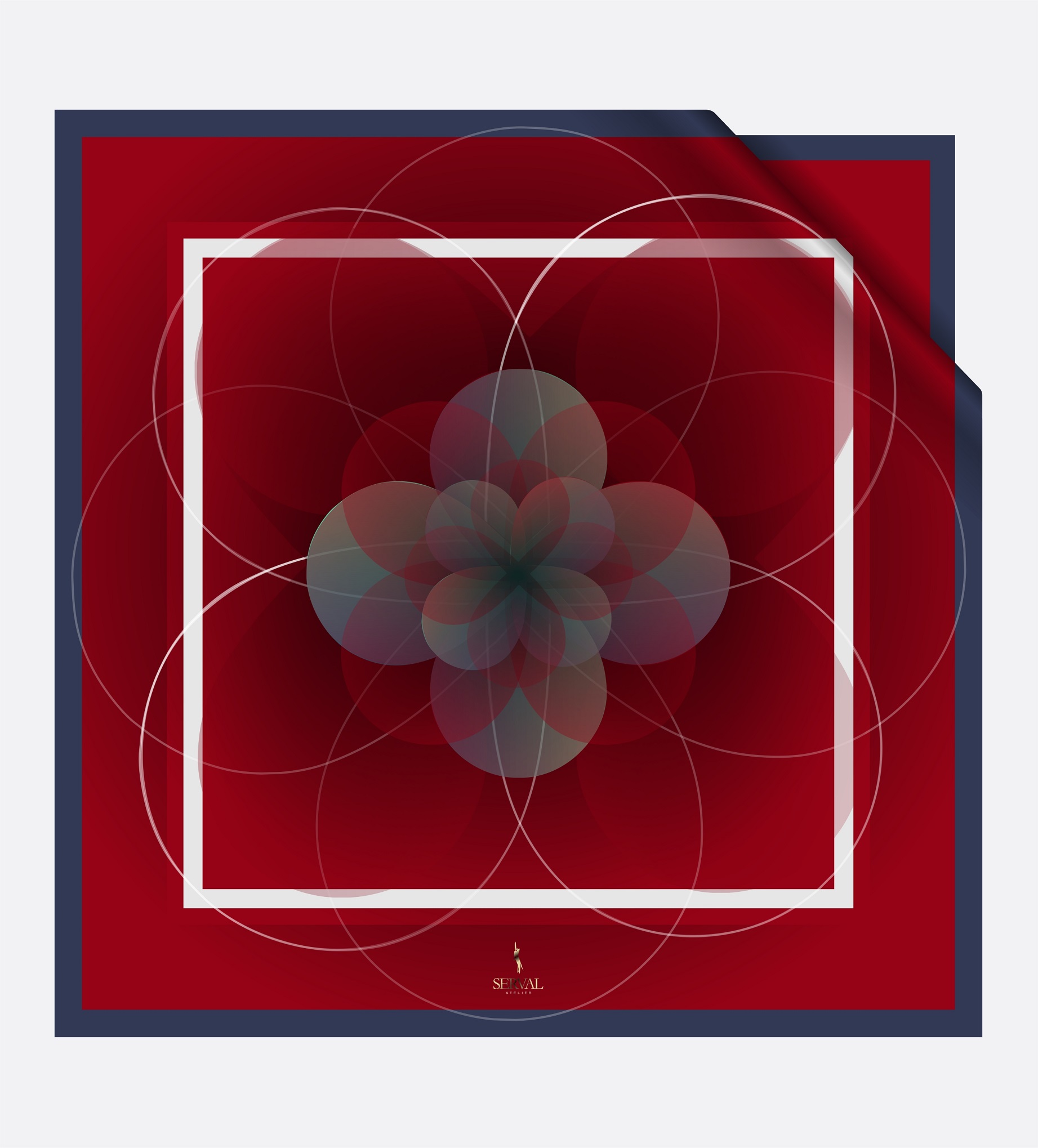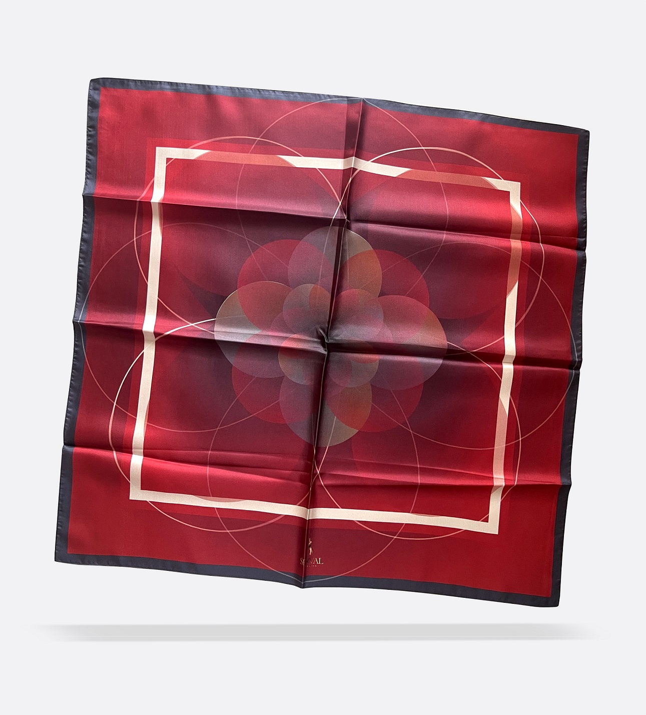Tondo Bordeaux twill silk scarf is created by combining forms of the natural world, characterized by sinuous, sculptural, organic shapes, arches, curving lines, and sensual ornamentation. The forms presented here in the interference of waves intertwine in an incredible way allowing to create fantastic color transitions.